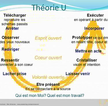 Modélisée par Otto Sharmer, du MIT, la théorie U est une méthode qui permet de prendre conscience collectivement d’un futur émergent. Elle facilite pour l’équipe et surtout l’éco-système les innovations.